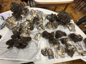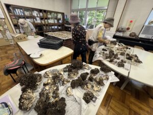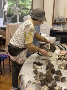「どんなものができたのだろう?」と想像を膨らませながら廃校に到着すると、ちょうど樹々の会では収穫したばかりの新鮮な原木マイタケの仕分けをされているところでした。