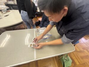 学生たちも到着したばかりで、ちょうど試作品を取り出すところ。