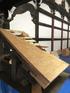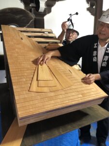 薄く削ったサワラの木の板を何枚にも重ねて葺く工法について解説していただきました。