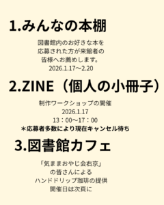 *ZINE(個人の小冊子)の制作ワークショップは、応募者多数のために、現在キャンセル待ちの状態です。
