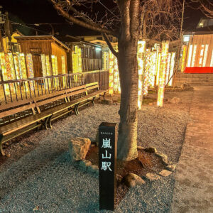 嵐電の嵐山駅に隣接して「きものフォレスト」があります。ここは友禅のポール600本を森のように配置している通り抜け自由の場所です。