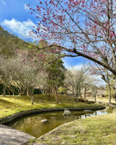 まだたまに雪がチラつく京北にもやっと春が近づいてきた模様で、山国神社横にある池の周りに梅が咲きだしました😊